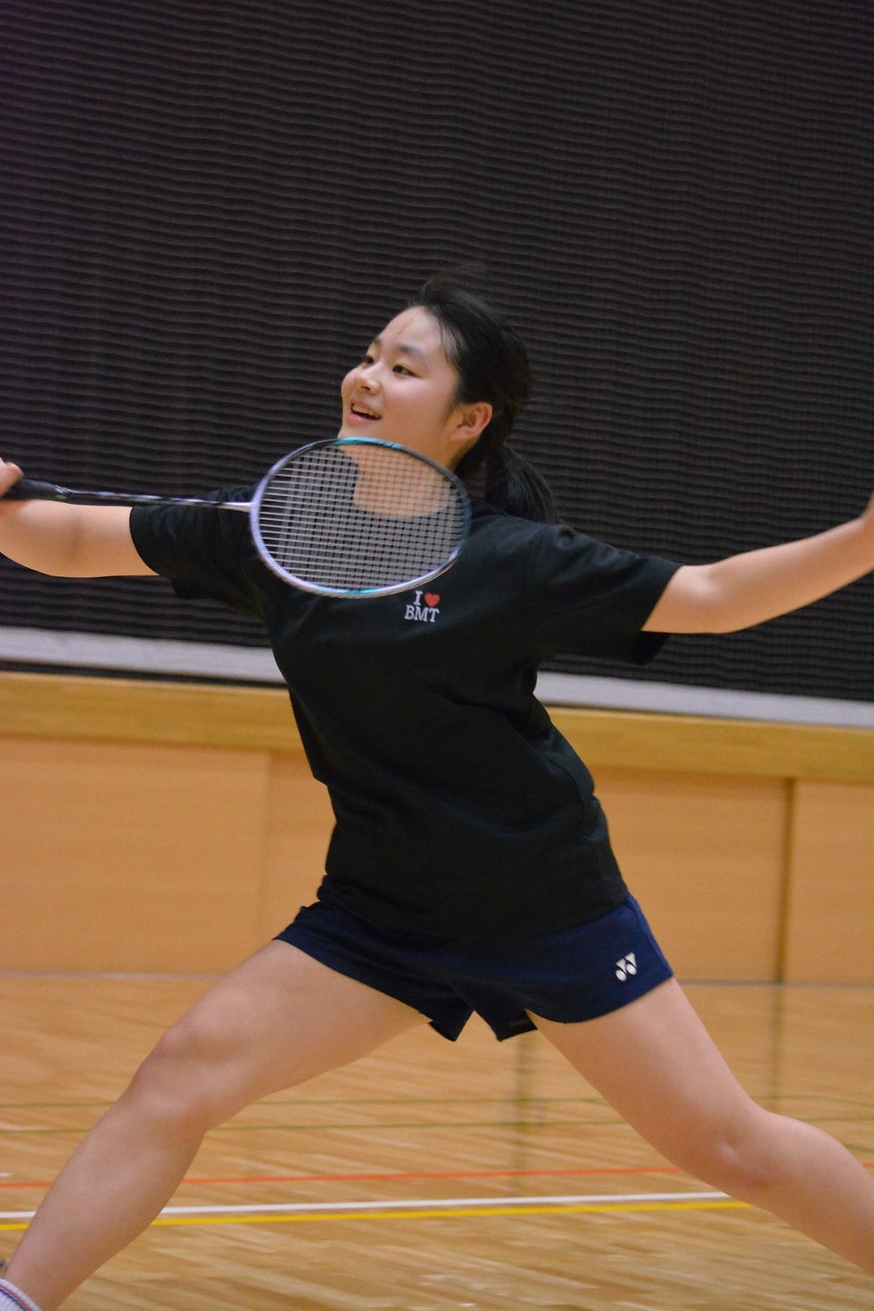強度あげてノックしているがまだまだギア上げれる。同級生が多くバドミントンを楽しみながらハードな練習に取り組めている。踵がついている時間が長いので小さなステップができると一気に上に行けると思う。